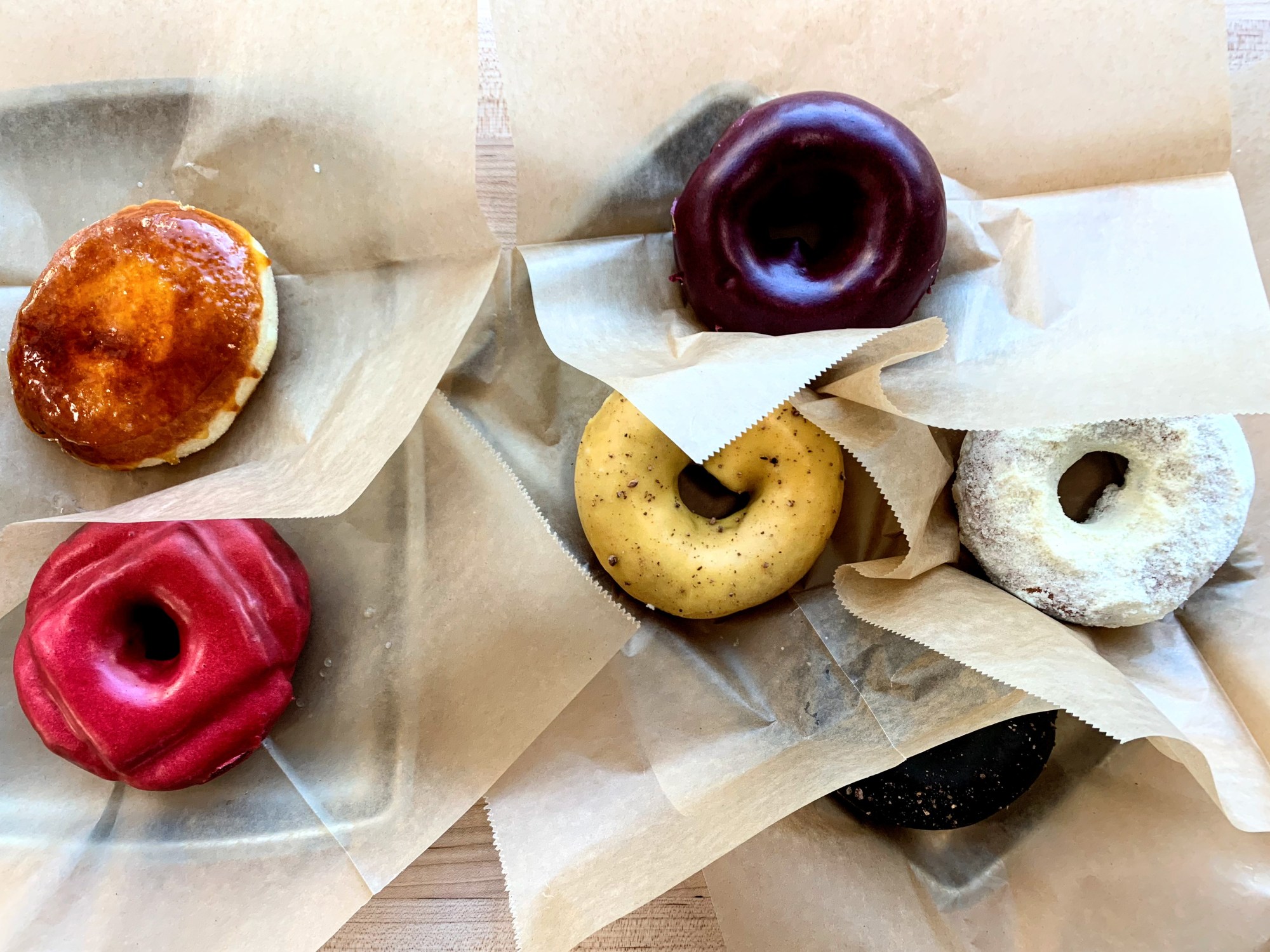 It was the moment of truth – In the last few years I had become a convert to Sidecar Doughnuts in LA and had been deeply disappointed by the Blue Star location in Venice Beach. Now, I was back in the motherland of BlueStar and was nervous if they would live up to the standards they had set for themselves all those years ago. Sure enough, every doughnut we tried was amazing. The headline photo was our complete order shared between 4 people – Passion Fruit Cake, Raspberry Rosemary Buttermilk (my fav), Blueberry Basil Cake, Passion Fruit Cocoa Nib, and Cointreau Crème Brûlée.
